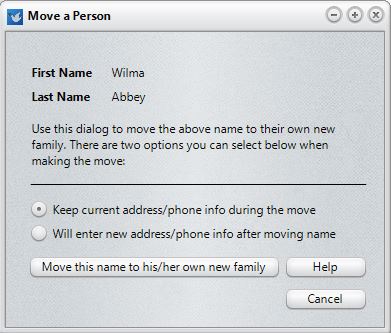 The Move Individual to New Family dialog appears whenever you select the Move a Person item on the Family Member Utilities drop-down box located in the lower left corner of the Family Members Data area on the Enter/Modify/Delete Names dialog.