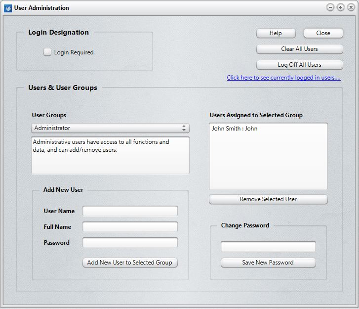 To add a user, first select the group to which the new user will belong using the drop-down list of user groups. A description of each group’s rights and limits is displayed under the drop-down list when a user group selection is made. If the name you wish to add does not appear on the users list, then enter the new name in the Add New Users group box in the space provided. You may enter it upper, lower, or mixed case,  however, case is ignored during login.